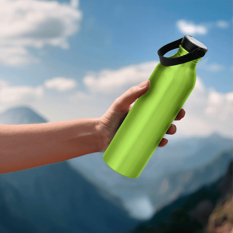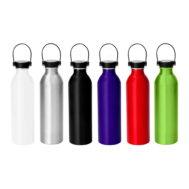 Botella colour, de aluminio con acabado brillante.Tapa a rosca de acero inoxidable , con tira color negro.