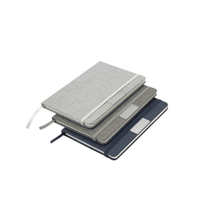 Libreta Tela, con tapa de cartón de 300g recubierta en tela, con placa metálica de 5 x 2 cm. Interior de 80 hojas rayadas en papel obra de 70g. Encuadernación cosida. Cierre con banda elástica del mismo color de la tapa. Personalizada con logo grabado en placa.