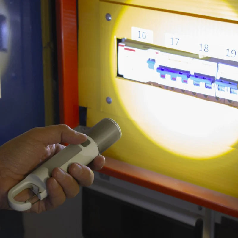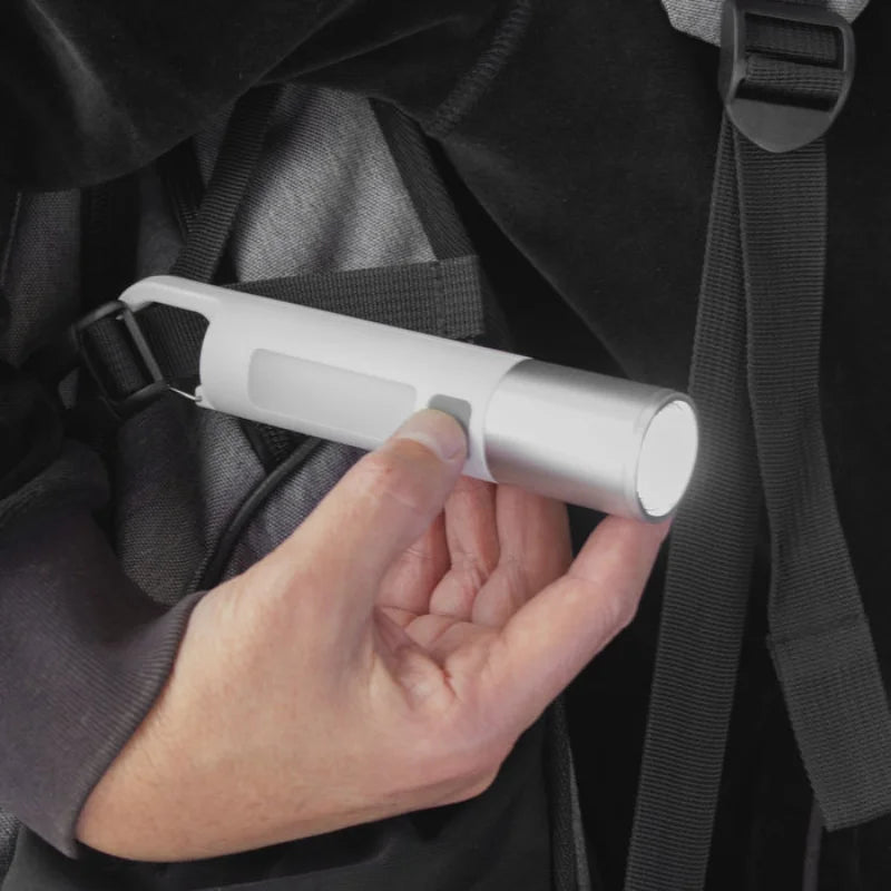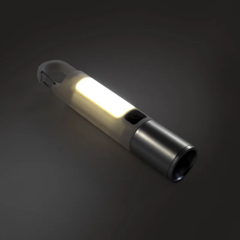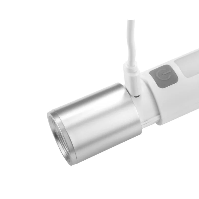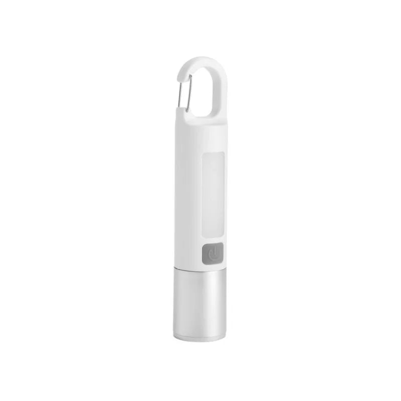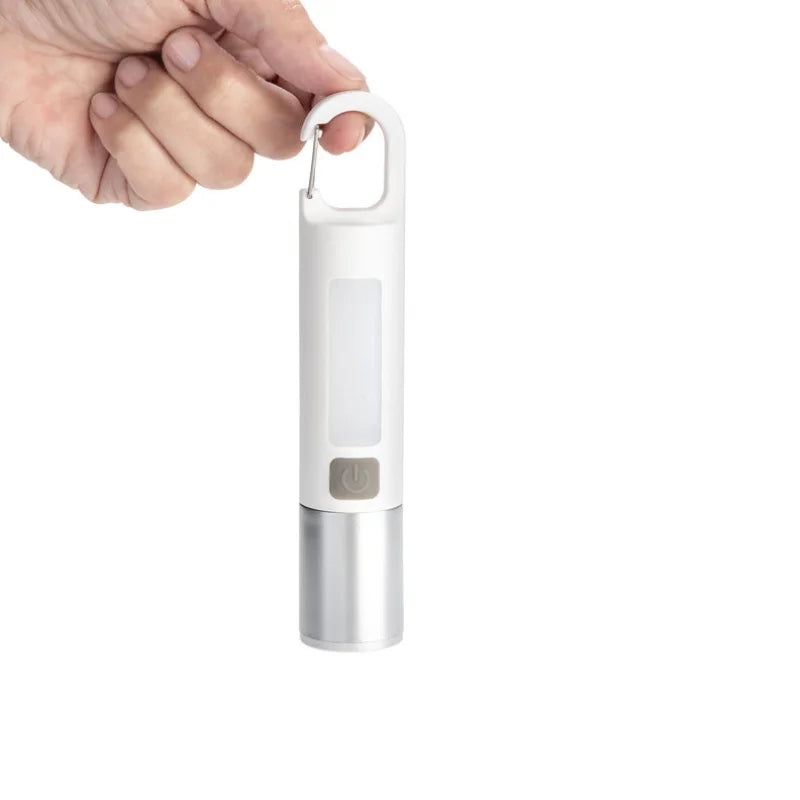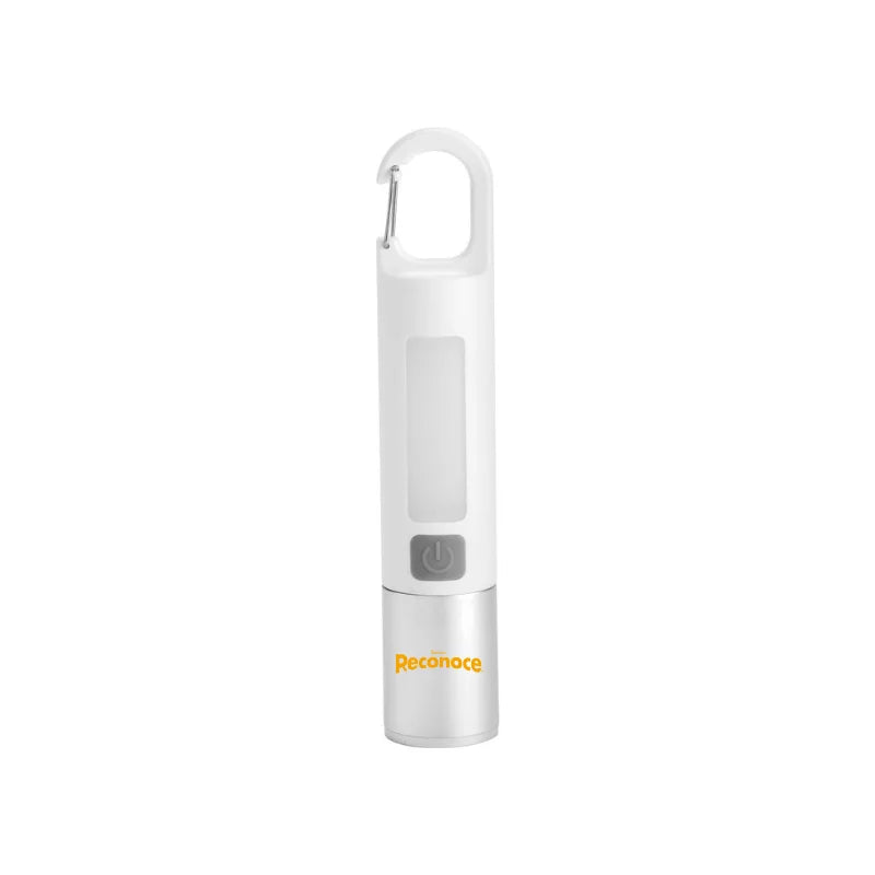 Linterna portátil recargable. Con mosquetón incorporado. Luz de emergencia y 2 intensidades de iluminación (alta e intermitente). Batería recargable 800 mAh. Fuente de luz 7 leds de alta potencia. Puerto USB-C oculto (se desplaza el cuerpo hacia arriba). Cable de carga color blanco. Personalizada con logo