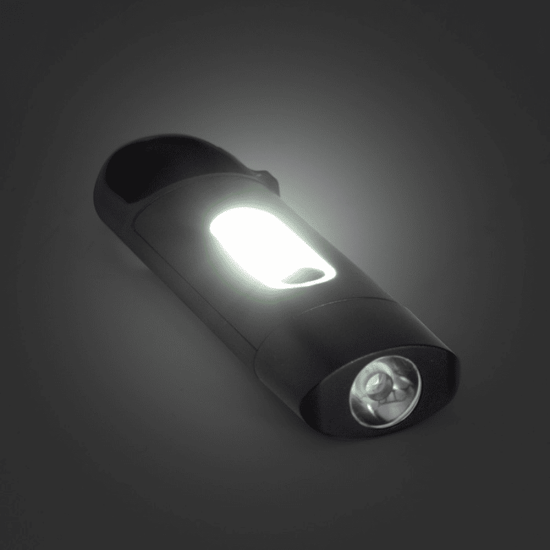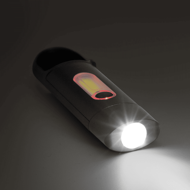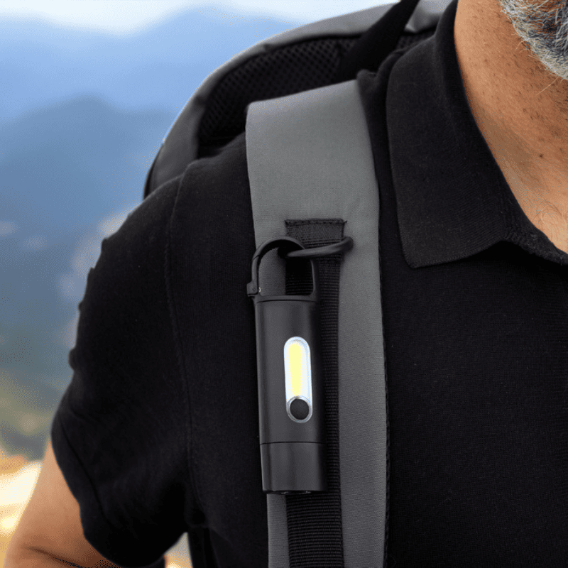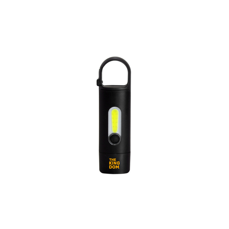 Linterna portátil recargable. Con mosquetón incorporado. Luz de emergencia y 3 intensidades de iluminación (alta, baja e intermitente). Batería recargable de 200 mAh. Puerto USB-C y cable de carga de 30 cm de largo color negro. Personalizada con logo