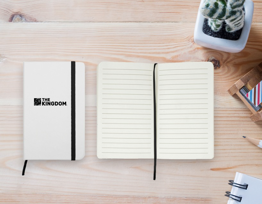 Libreta de Bolsillo medidas 14,3 x 9,2 cm. Tapa dura color blanco con logotipo a color, 80 hojas LINEALES