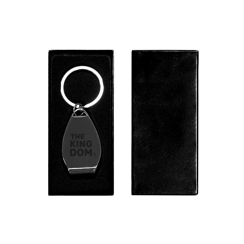 Llavero con Logo plano que se puede usar como destapador. Presentación en caja de regalo con cinta tricolor.