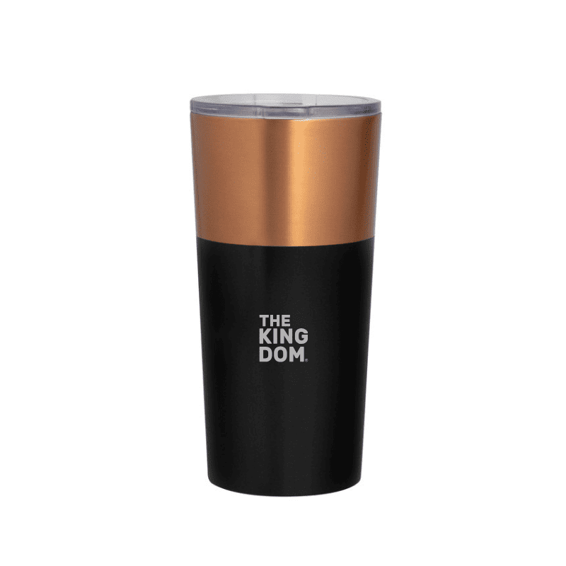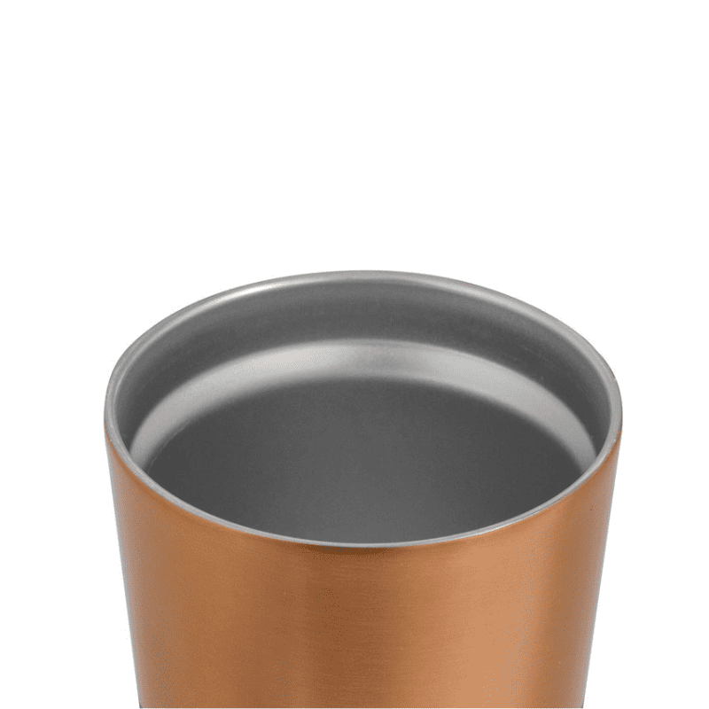 Mug doble pared, sellado al vacío. Interior y exterior en acero. Tapa plástica transparente a presión con anillo de silicona. Pintura exterior con acabado mate en color negro y cobre. Mantiene hasta 12 hs la temperatura de las bebidas calientes y 24 hs de las bebidas frías