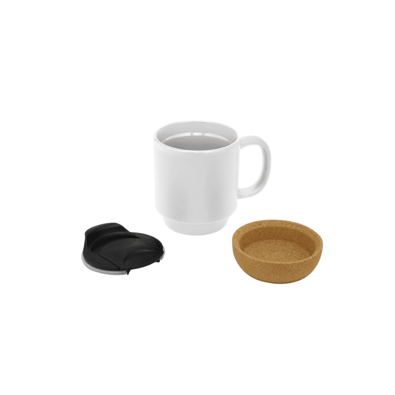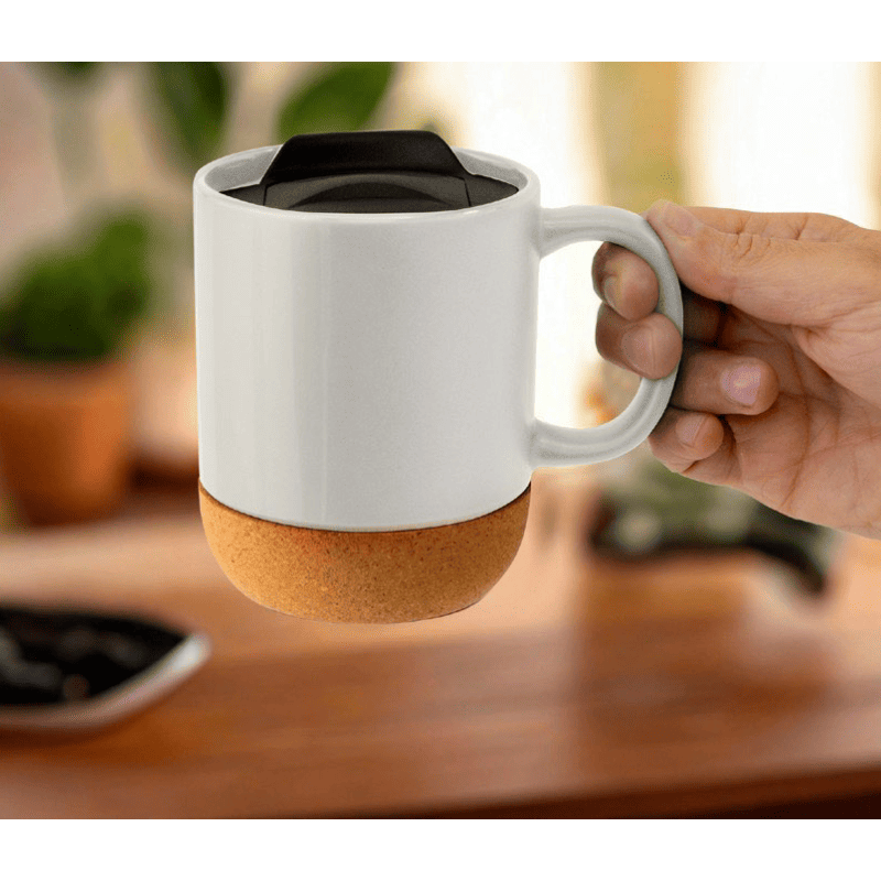 Taza cerámica con tapa plástica a presión color negro con anillo de silicona. Base de corcho. Pintura con acabado mate. Producto apto para microondas siempre retirando la base de corcho. Personalizada con logo