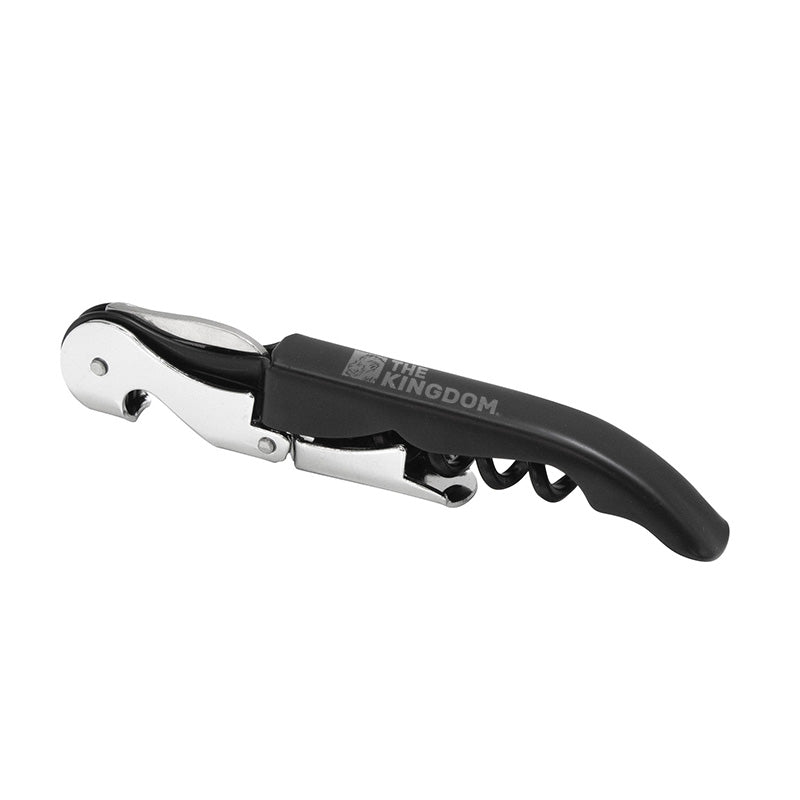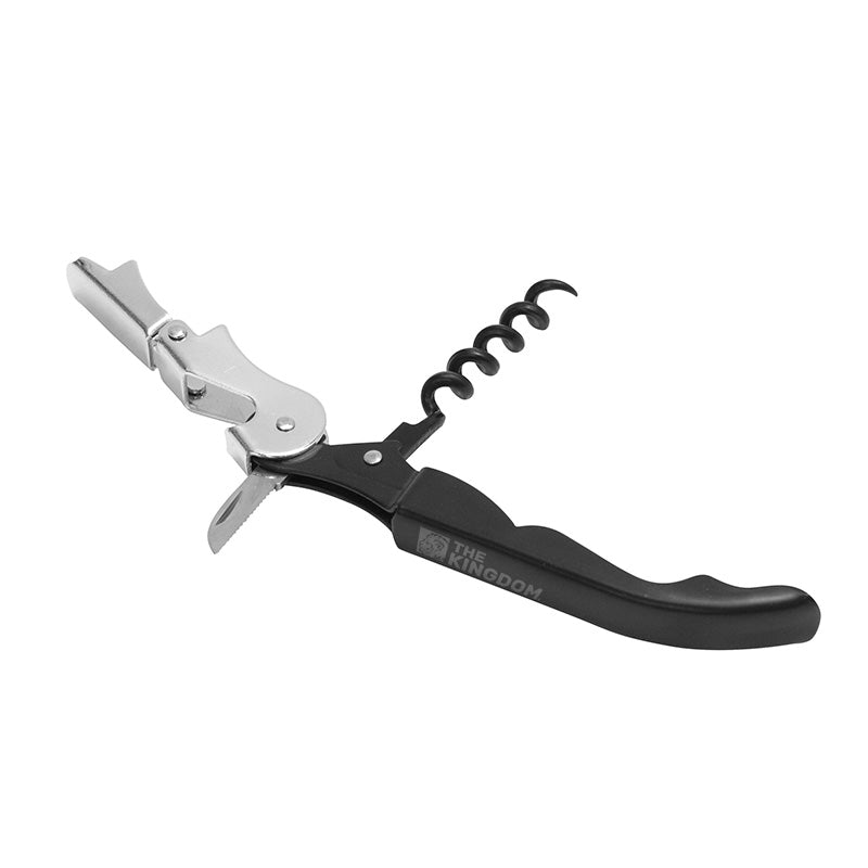 • Un abridor de botellas de acero inoxidable con acabado negro mate.