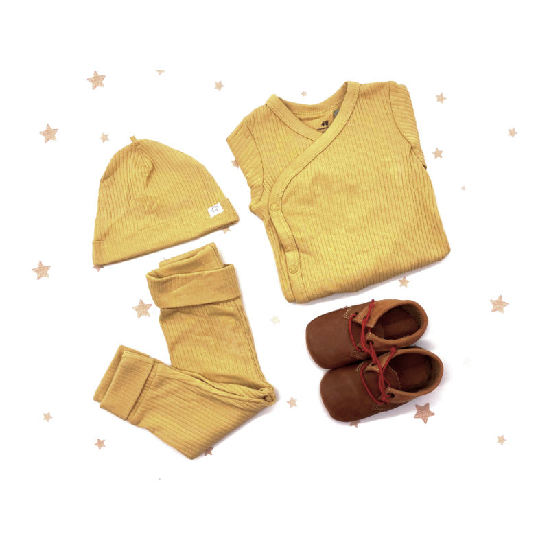 • Conjunto tres piezas de algodón 98% orgánico: gorrito, body y pantalón.