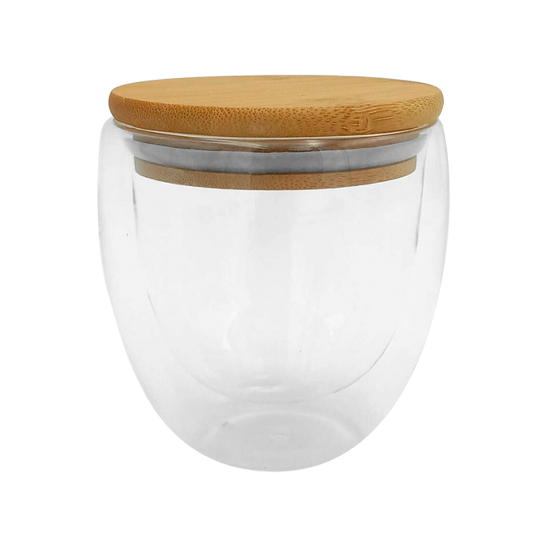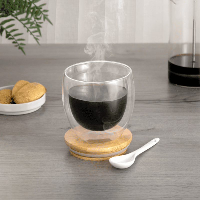 Taza de doble vidrio con tapa de bambú con logo, que ademas se puede utilizar como posa taza/vaso. Capacidad 350 ml.
