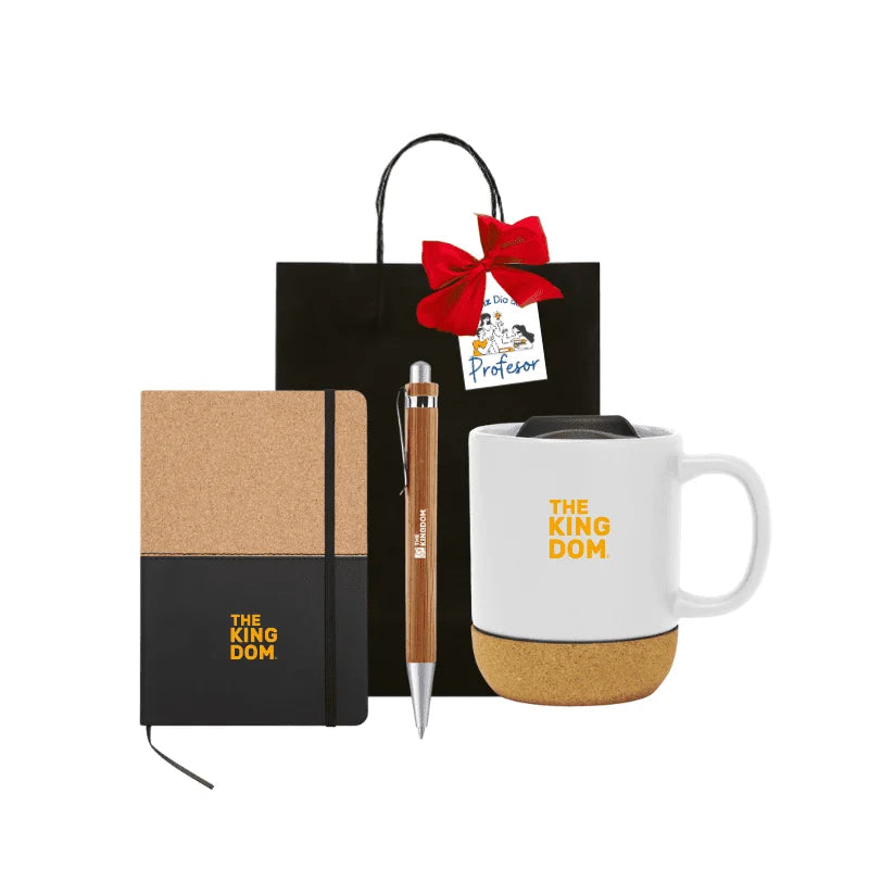 Regalo 3. Incluye: Libreta de símil corcho con 1 Logo Full Color, 80 hojas con renglones punteados, medidas tamaño 21 x 14,2 x 1,3 cm, más Bolígrafo de bambú con Logo Full Color, Tinta azul, y Taza cerámica gres con logo full color con tapa plástica a presión color negro con anillo de silicona. Base de corcho. Presentado en Bolsa Kraft con Sticker Personalizado