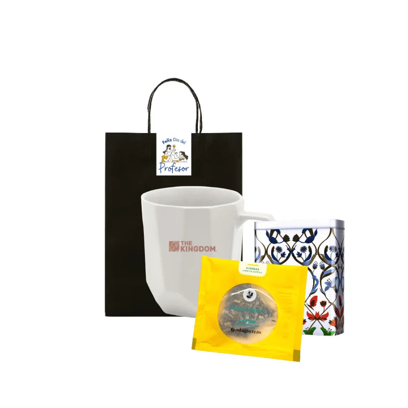 Regalo 8:Taza de cerámica gres Capacidad de 270 ml, con logo Full Color en Relieve más 1 Tea bag marca Adagio y 1 caja de lata para transportar sachet. Presentado en Bolsa Kraft con Sticker Personalizado