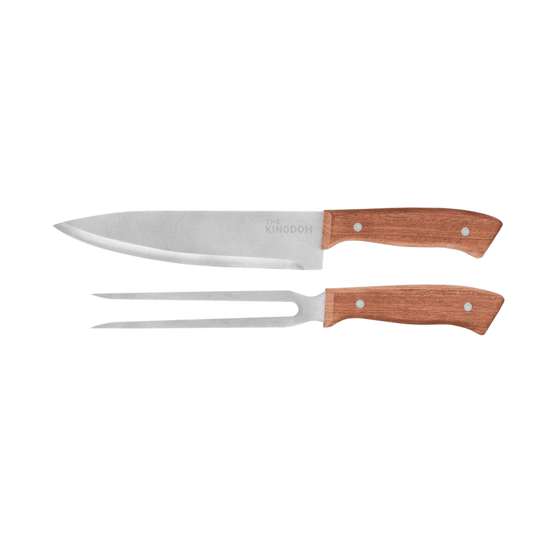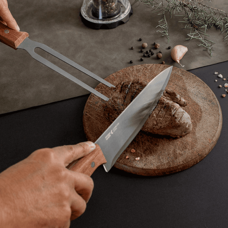 Acero inoxidable y Madera de Acacia. Set de 2 utensilios: Cuchillo chef de 33,5 cm y 175 g. Tenedor de 31,3 cm y 125 g., ambos con mango de madera.