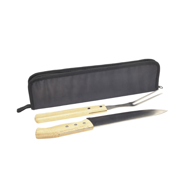 Set Asado 9,5 x 35,5 (estuche cerrado) 20 x 35,5 (estuche abierto). Tenedor: 33 cm y cuchillo: 32,5 cm. Acero inoxidable y madera + Poliéster. Set de cuchillo y tenedor con mango de madera. Estuche de poliéster con cierre. Personalizado con logo en cuchillo.