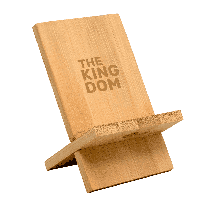 Soporte de escritorio para celular. Cuenta con orificio que permite el paso del cable para facilitar la carga del dispositivo. Práctico y transportable.