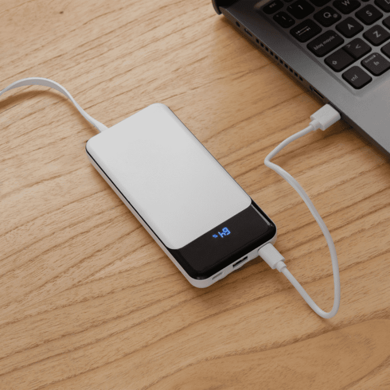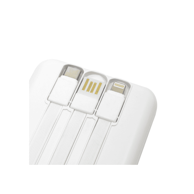 Powerbank multipuerto. Pantalla LCD. 2 entradas USB tipo C. 1 salida USB. Entrada y Salida de carga rápida 5V 2A. 3 cables de carga integrados: USB standard, USB Tipo C y lightning. Personalizado con logo