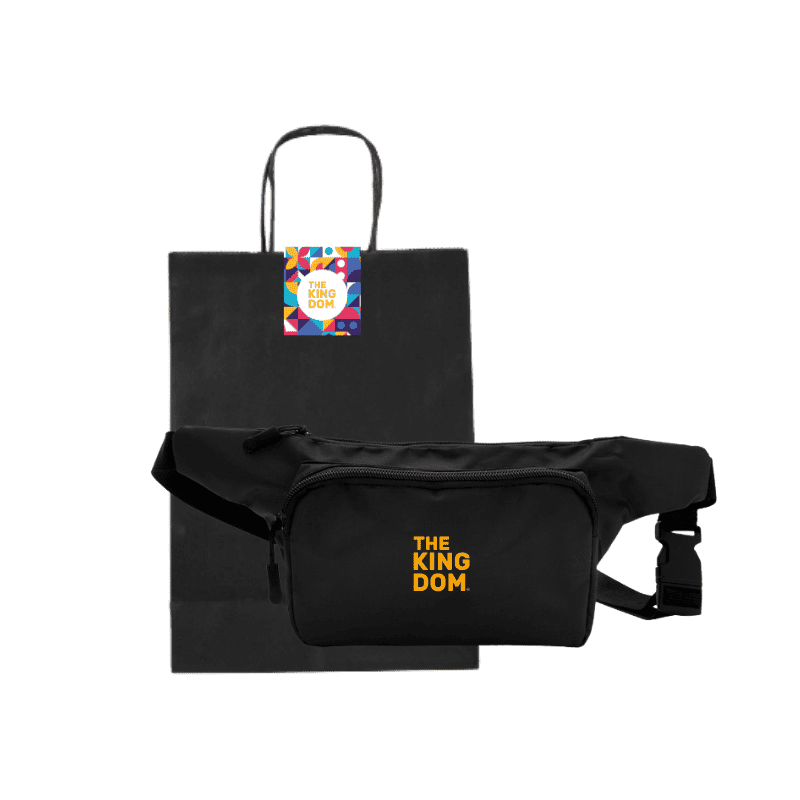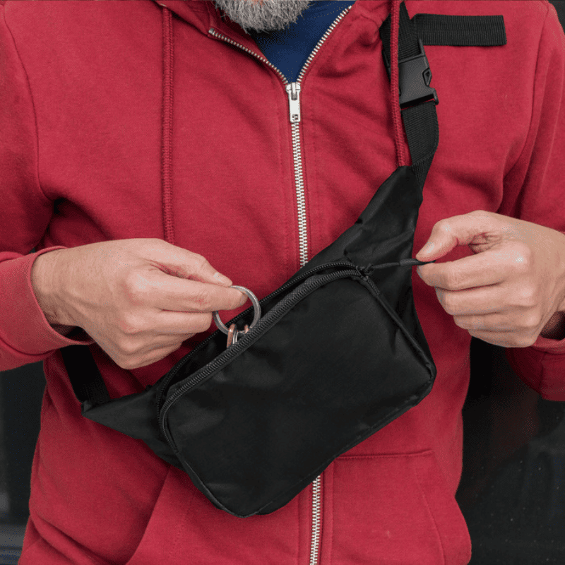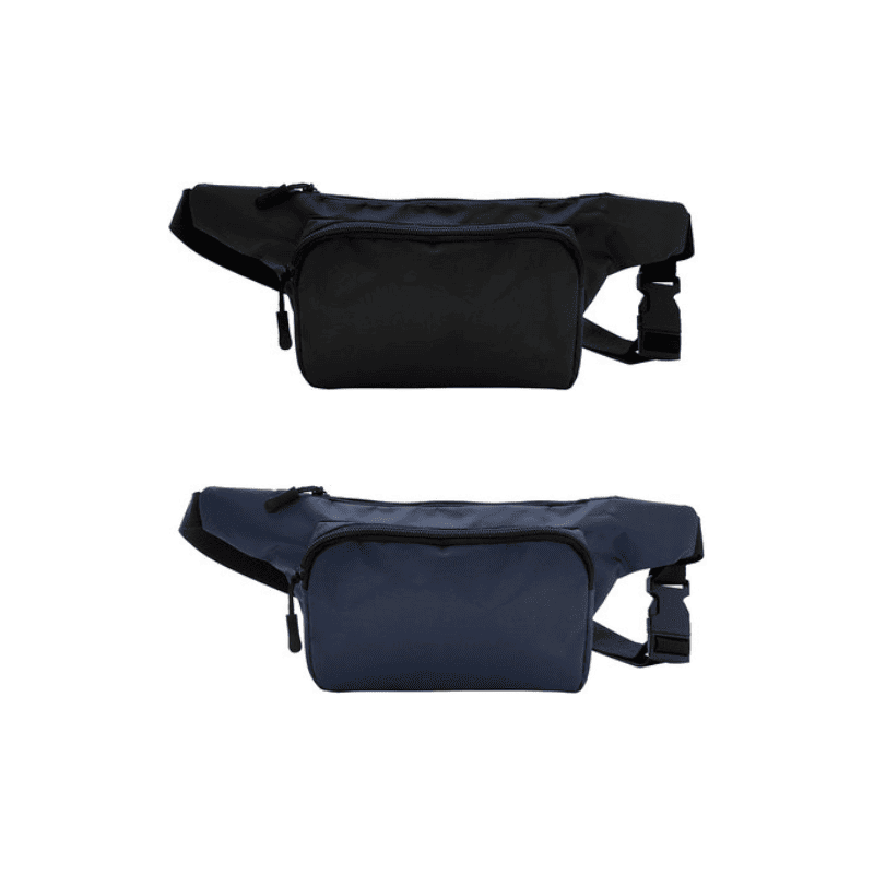 Banano con 2 compartimentos con cierre. Amplio bolsillo frontal. Correa ajustable con herrajes plásticos. Cierres y tiradores de cierre plásticos de color negro. Personalizado con logo. Medidas: 34 x 14 x 7,5 cm. Presentado en bolsa kraft con sticker de cierre personalizado